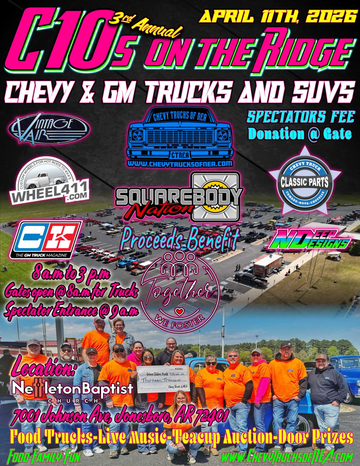 3rd Annual Chevy Trucks of NEA C10's on the Ridge APRIL 11TH, 2028:00 AM - 3:00 PMNETTLETON BAPTIST CHURCH7001 JOHNSON AVE, JONESBORO AR 72401 Teacup Auction - Raffle - Food Trucks - Live FREE Music - And More! Need to book a room? We have teamed up with Fairfield By Mariott just off I555 as you come into Jonesboro and Courtyard by Mariott just 2 miles from the show. Click below to book your room today! Sponsors 727 Motorsports - Advance - Arkansas C1/0 Club - Auto Zone - Bedwood - - BTR Racing - Ben Charles Tuning - Blake Nichols - BTR Cams - CK Truck - CINTAS - ControlTec Inc - Core Edge Knives - Creeds Customs - Custom Care - Dakota Digital - Extreme ATV - Extreme Creation - Flat Out Autos - Glowshift - Gravel Road Customs - Harley Davidson - Hedges Port-a-Pottys - Ian Novinger - Joe Henry - Keg Hauling - Lemonade House Grill - Midsouth Air - N Deep Designs - Nettleton Baptist Church - Nucor - Prestige Plumbing - QA1 - QuickLane - Sideline Graphics - Slosh Tubz - Smith Transmission - Snap on - The Shop - The Tint Shop - Tuff Tunes - Vintag Air - Williamson Motor Co - Wheel 411 Contact us for more information or Sponsorship. Please enable JavaScript in your browser to complete this form.Please enable JavaScript in your browser to complete this form.Your Name *Your E-mail *Your Phone *Your Message *Send Now Facebook